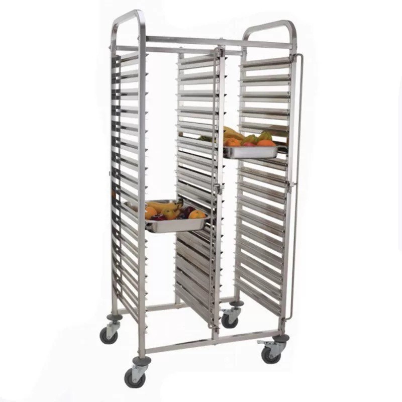 High-quality stainless steel folding tray trolley designed for professional bakery and restaurant use.
